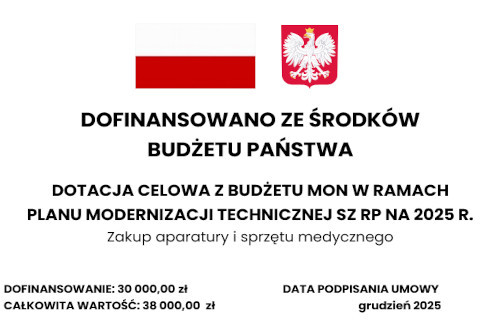 Opis zadania: Celem projektu jest zabezpieczenie 20. WSzU-R SPZOZ w Krynicy-Zdroju w nowoczesny i niezbędny sprzęt oraz aparaturę medyczną przeznaczoną do rehabilitacji pacjentów w zakresie fizykoterapii, kinezyterapii oraz innych zabiegów leczniczych.